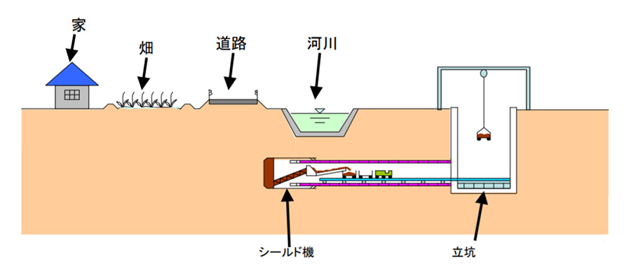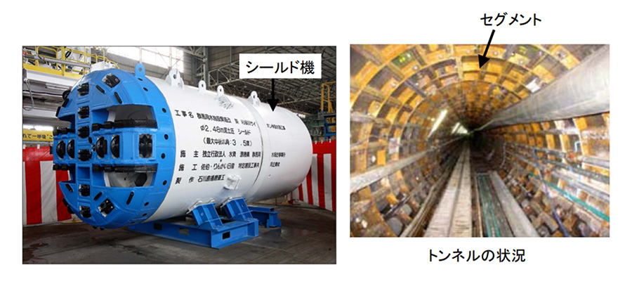 シールド工法は、シールド機などの各種機械を使用してトンネルを造る工法です。シールド機でトンネルを掘削直後に、トンネル壁面をセグメントで囲み造ります。