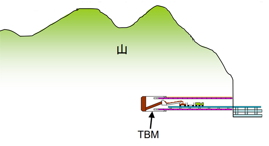 TBM工法は、シールド工法と同様に機械を利用してトンネルを掘削する工法で、掘削機械をTBM(トンネル・ボーリング・マシン)と呼びます。TBMでトンネル掘削後、セグメントで囲み造ります。
