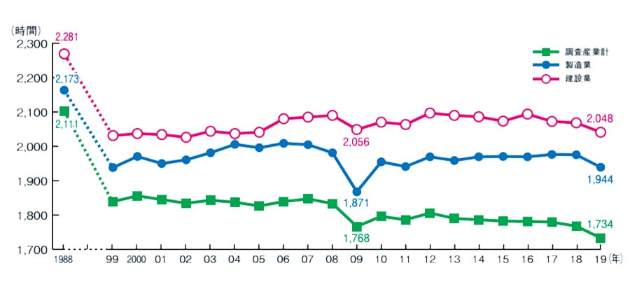 建設業は他産業よりも労働時間が長く、2019年時点の労働時間は、調査産業計が1,734時間に比較して建設業は2,048時間となり、300時間超の長時間労働となっています。