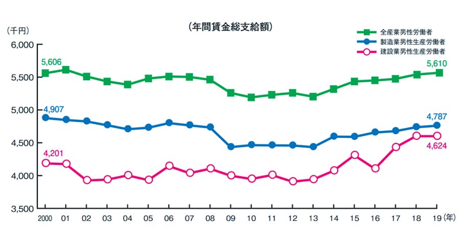 グラフを見ると、建設業における男性労働者の賃金は、2000年以降において他産業との格差が拡大傾向にありましたが、2012年以降においては上昇に転じて賃金格差は縮小傾向にあります。