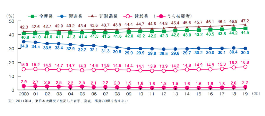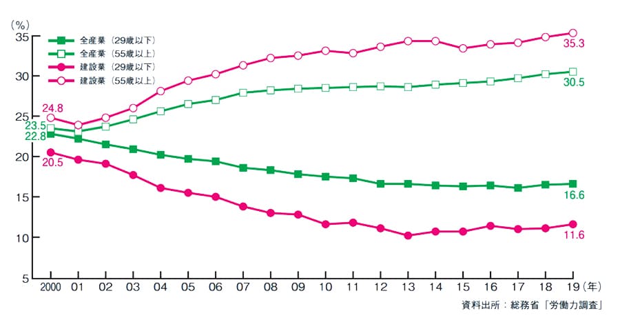 2019年時点の全産業における55歳以上の就業者割合が30.5%に対し、建設業就業者割合は35.3%あり、高齢化の割合は高くなっています。